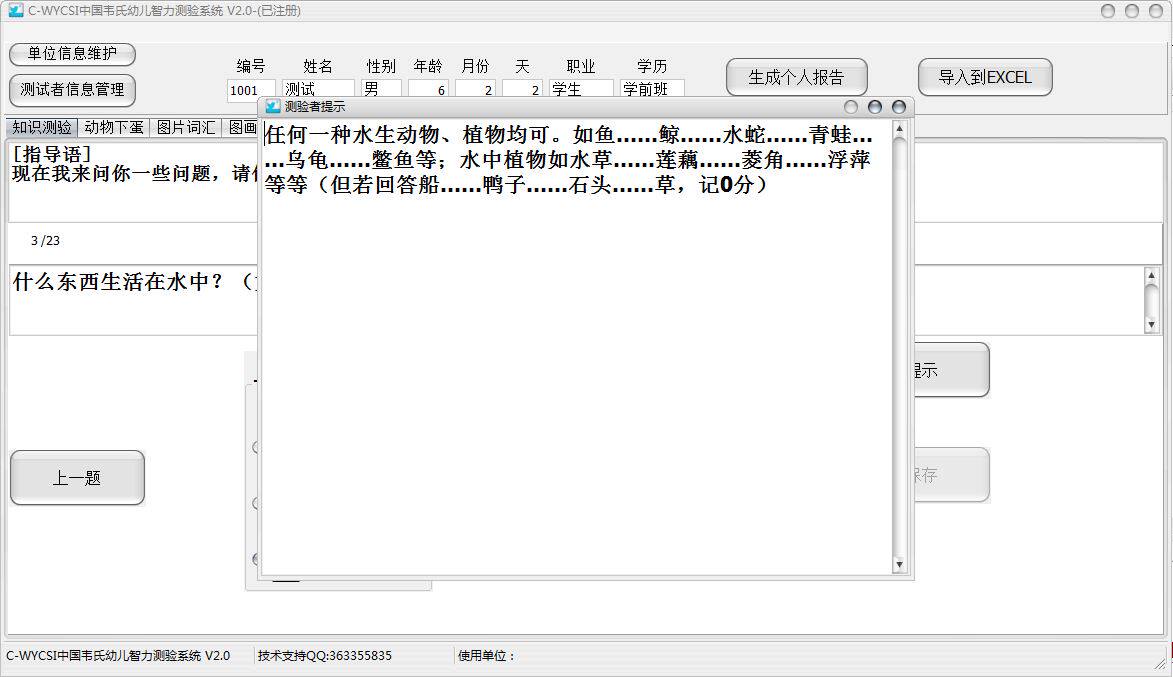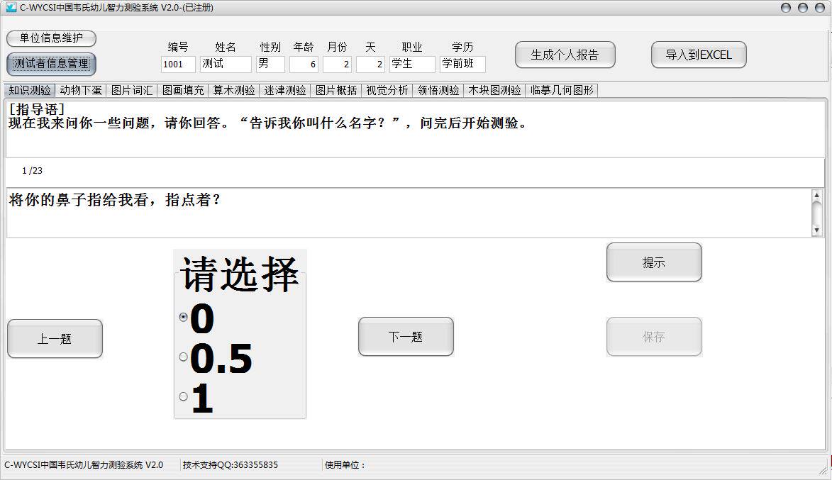 注:系统会自动判断是否是免试题,如是免试题会自动跳过并记满分。在测验过程中系统会自动根据测试者的年龄、城市、农村等信息自动调整测验顺序,实现智能化测试;分测验都带有提示,可以给施测者提示如何评分,无需再去查手册。