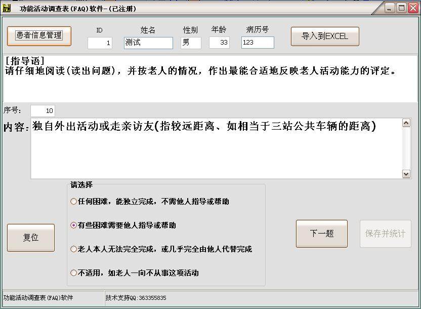 1.FAQ的内容,虽然也包括了部分生活自理能力,但更偏重于社会适应能力,后者对于老人能否在社会上独立生活,至关重要。本量表是按西方国家的社会标准设计的,经修改后也适用于我国。各单项中,除技巧性活动项(如画图、打牌、工艺活动等),不适合率较高(38.8%)外,其余项目的适合率在90%以上,属较好的社会功能量表。内容具体,评分标准明确,操作也较简单。